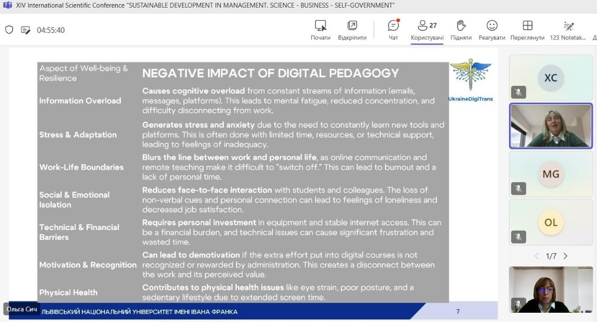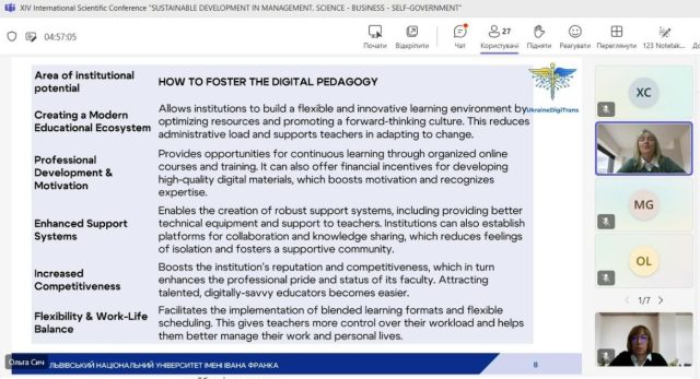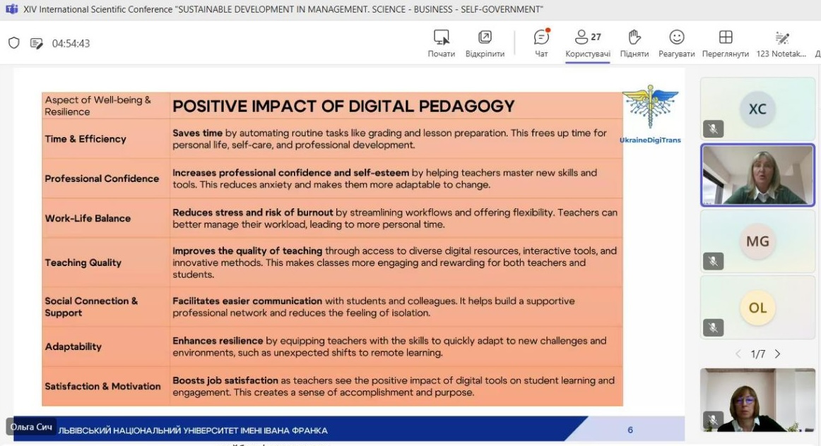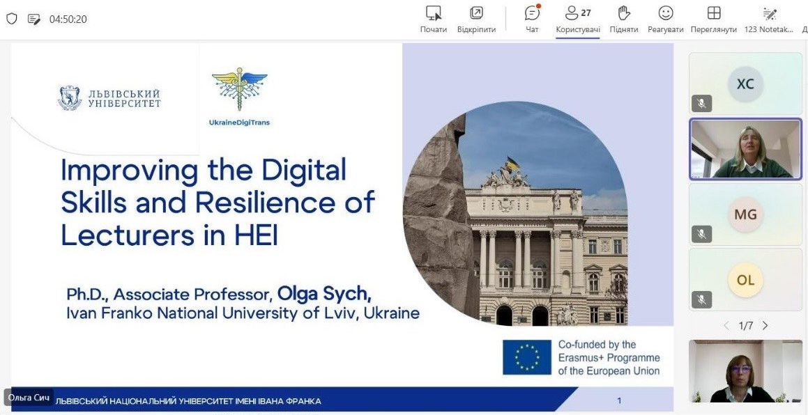 В межах другої секції доповідь виголосила учасниця команди проекту UkraineDigiTrans від ЛНУ імені І. Франка Ольга Сич  на тему «Підвищення цифрових навичок та стійкості викладачів у вищих навчальних закладах». В презентації було окреслено поняття цифрових навичок та цифрової стійкості, представлено переваги та вузькі місця впровадження цифрових інструментів у освітній процес. На завершення було запропоновано кроки на інституційному рівні для підвищення резильєнтності викладача в цифрову епоху. Доповідь викликали зацікавленість учасників конференції та обговорення можливості подальших спільних досліджень щодо впровадження ШІ в освітній процес.